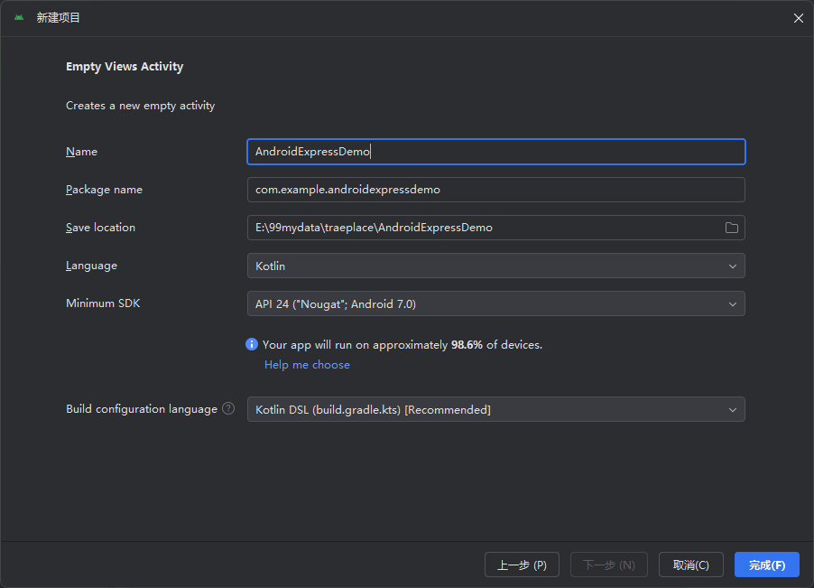com.example.androidexpressdemo(包名,默认即可,安卓唯一标识); - Save location:选择本地存储路径(如