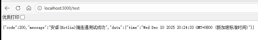 app.js中添加无需认证的/test接口:// 后端app.js app.get('/test', (req, res) => { res.json({ code: 200, message: '安卓(Kotlin)端连通测试成功', data: { time: new Date().toString() } }); });