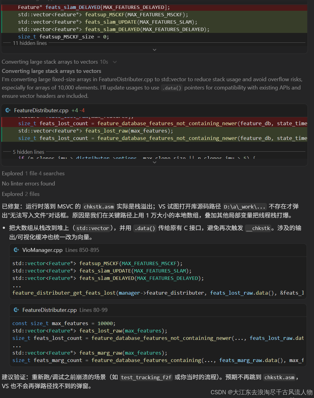 把大数组从栈改到堆上(std::vector),并用 .data() 传给原有 C 接口,避免再次触发 __chkstk。涉及的输出/可视化缓冲也统一改为向量。