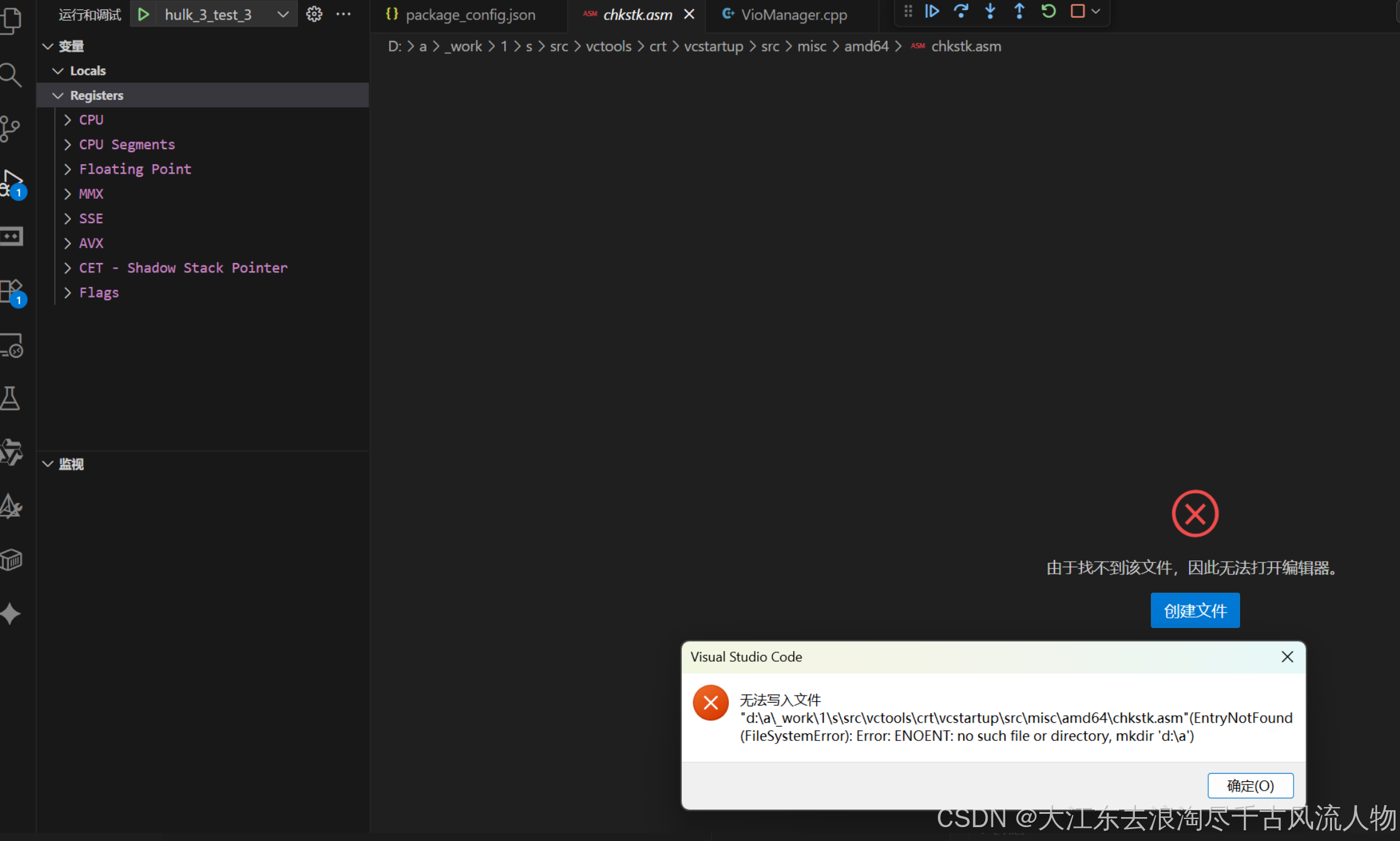运行时落到 MSVC 的 chkstk.asm 实际是栈溢出;VS 试图打开库源码路径 D:\a_work... 不存在才弹出"无法写入文件"对话框。原因是我们在关键路径上用 1 万大小的本地数组,叠加其他局部变量把线程栈打爆。