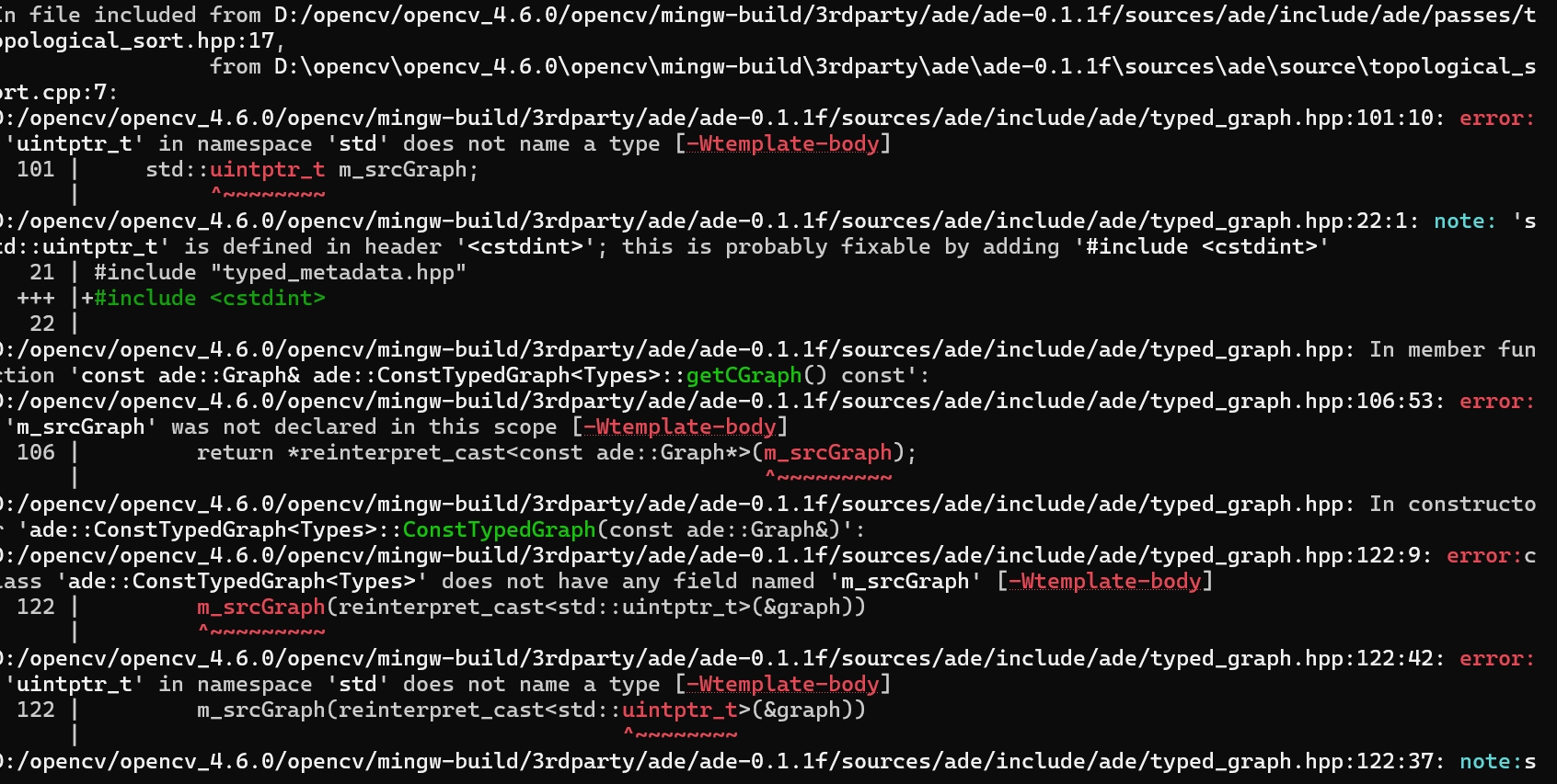 D:/opencv/opencv_4.6.0/opencv/mingw-build/3rdparty/ade/ade-0.1.1f/sources/ade/include/ade/typed_graph.hpp:101:10: error: 'uintptr_t' in namespace 'std' does not name a type [-Wtemplate-body] 101 | std::uintptr_t m_srcGraph;