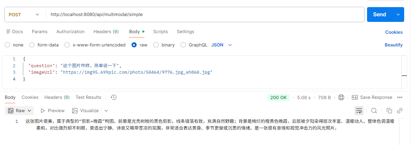 - 「流式 SSE 调用」:分段向前端推送模型回答(适合大文本、实时性要求高的场景);整体用于处理「图片 + 文本」的多模态问答请求(比如上传图片 URL,提问 "图里有什么?",返回模型的回答)。