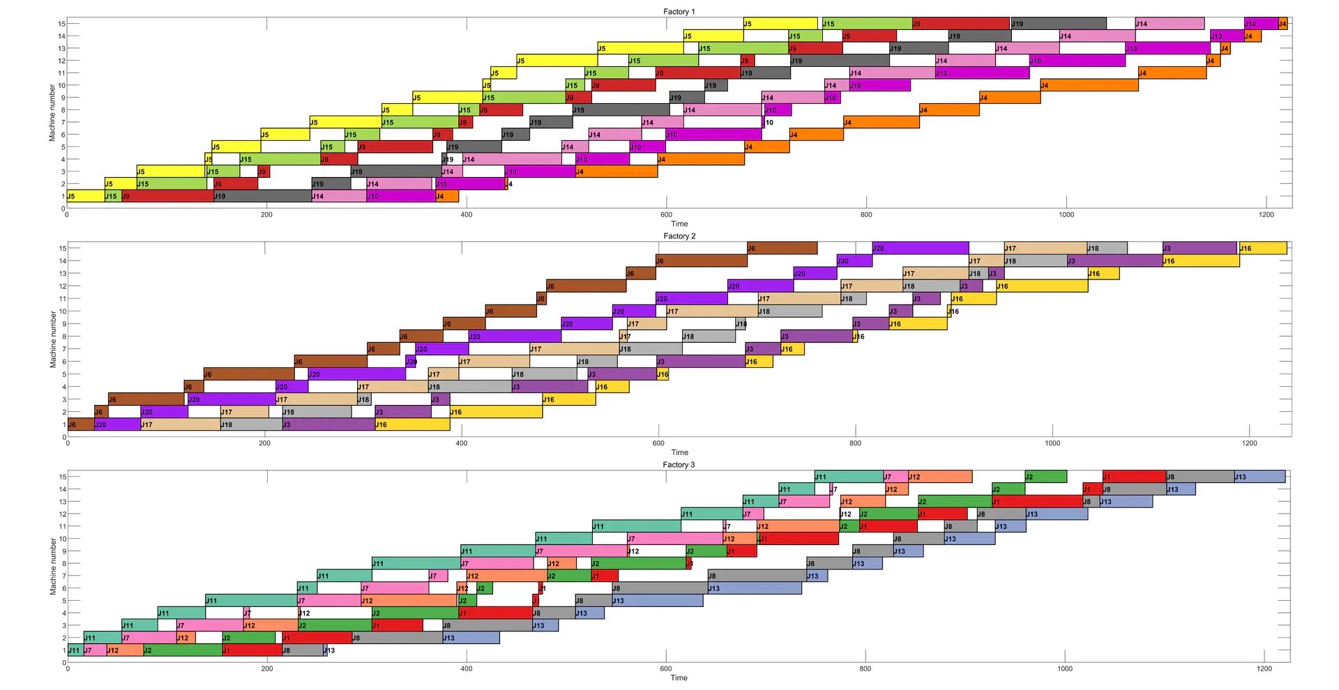 gantt_chart.m绘制,是调度结果最直观的可视化展示。就像前面提到的20工件×15机器、3工厂的调度结果甘特图,能让我们一眼看清每个工件在各个机器上的加工安排。