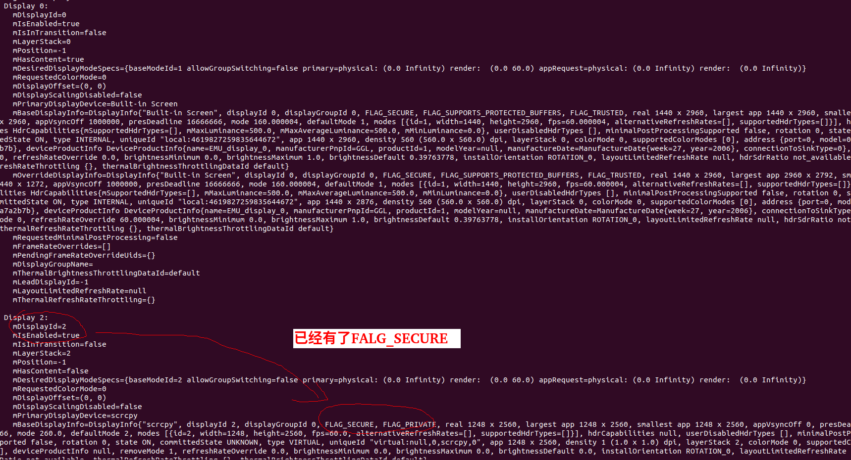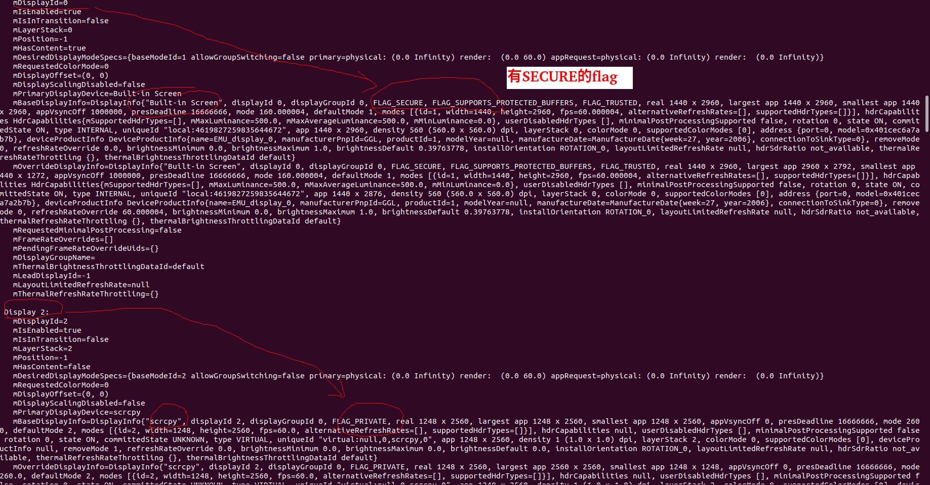 可以看出完全scrcpy的虚拟屏幕没有FLAG_SECURE的安全flag,所以自然无法展示出有secure为true的Layer。