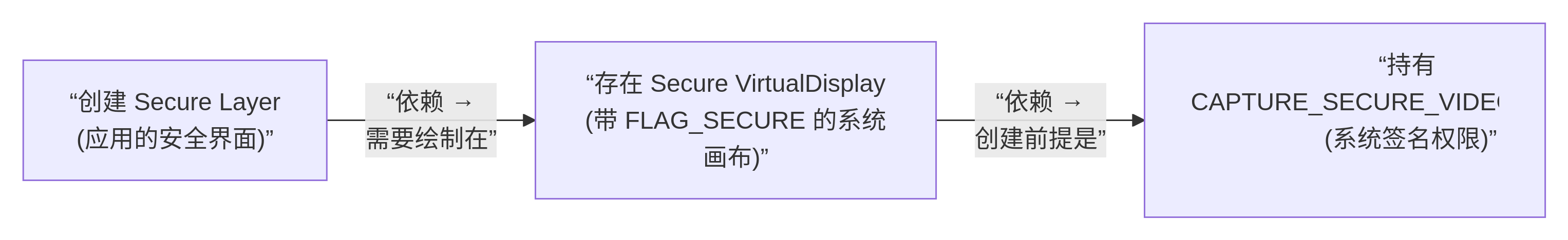 VIRTUAL_DISPLAY_FLAG_SECURE这个flag就是用来创建一个安全的虚拟屏幕,在创建虚拟屏时候设置了这个标志位后,对应的Display对象的flag就会带上FLAG_SECURE,带有安全的标志的屏幕就可以展示上面isSecure=true的Layer,但是创建这样一个secure的Display是需要有CAPTURE_SECURE_VIDEO_OUTPUT权限的,这个权限对第三方app不可以用。
