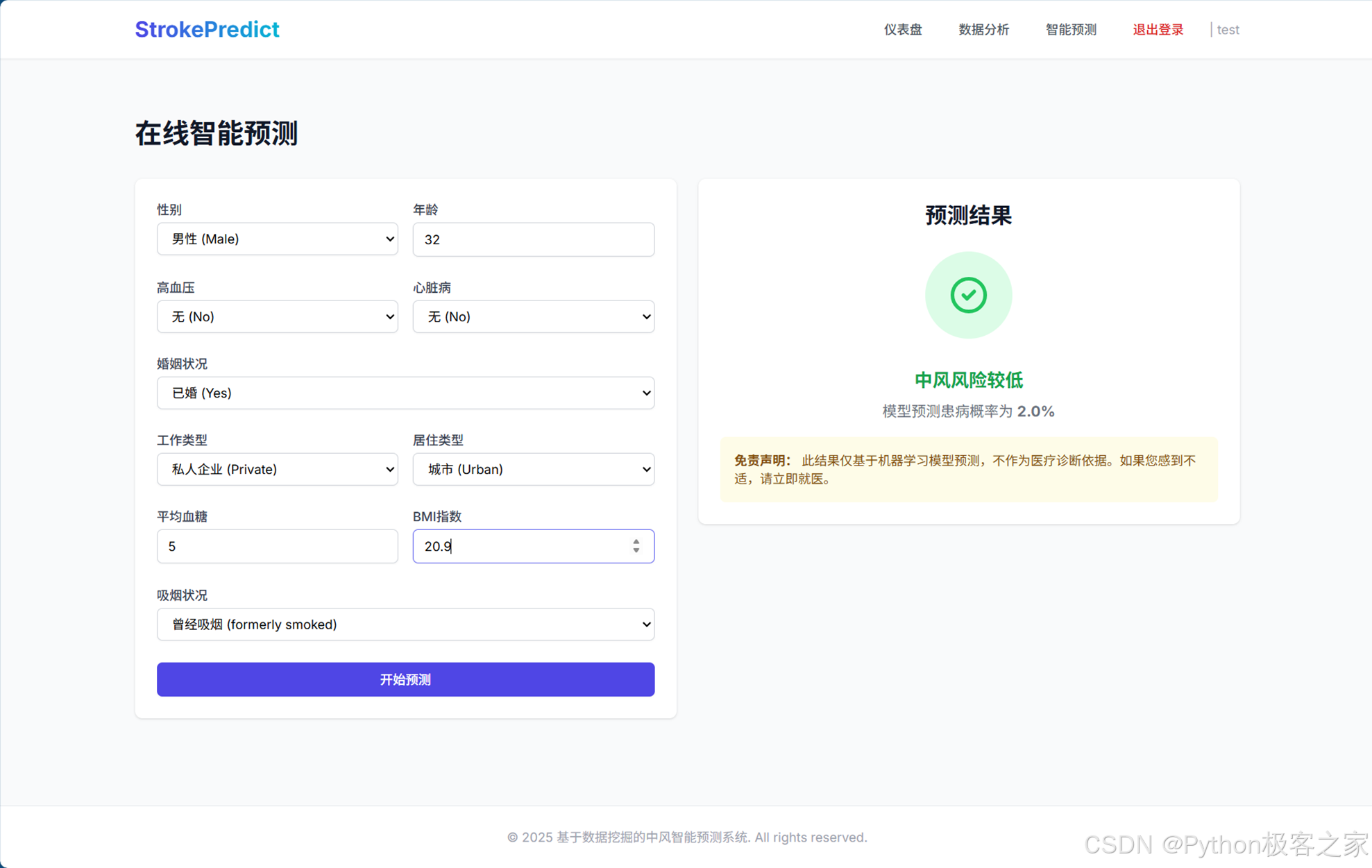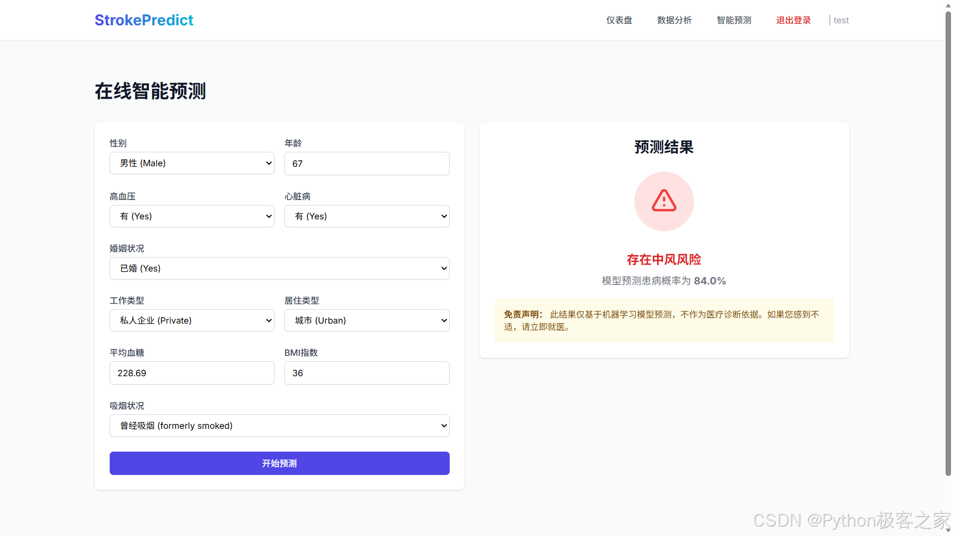 本项目成功实现了一个从底层算法到上层应用的中风智能预测系统。