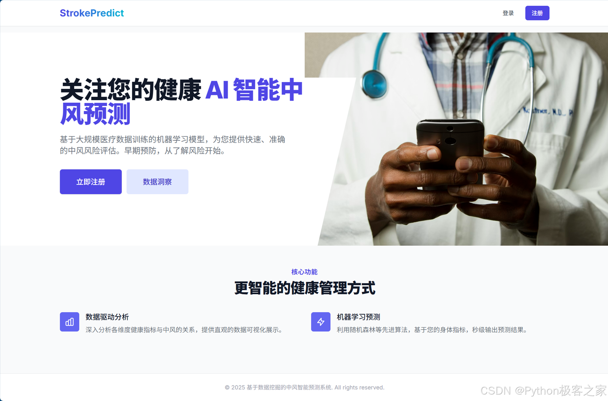 随着医疗大数据的快速发展,利用机器学习技术辅助疾病诊断已成为智慧医疗的重要方向。本项目开发了一套基于数据挖掘的中风智能预测系统。该系统旨在通过分析患者的性别、年龄、生活习惯(如吸烟)、生理指标(如血糖、BMI)等数据,挖掘潜在的中风风险因素,并构建高精度的预测模型。