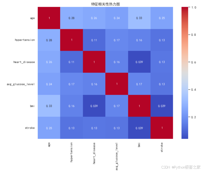 avg_glucose_level和bmi等连续变量进行标准化处理。 - 模型训练 : 选用 Random Forest Classifier,因为它能够很好地处理非线性关系且抗过拟合能力强。