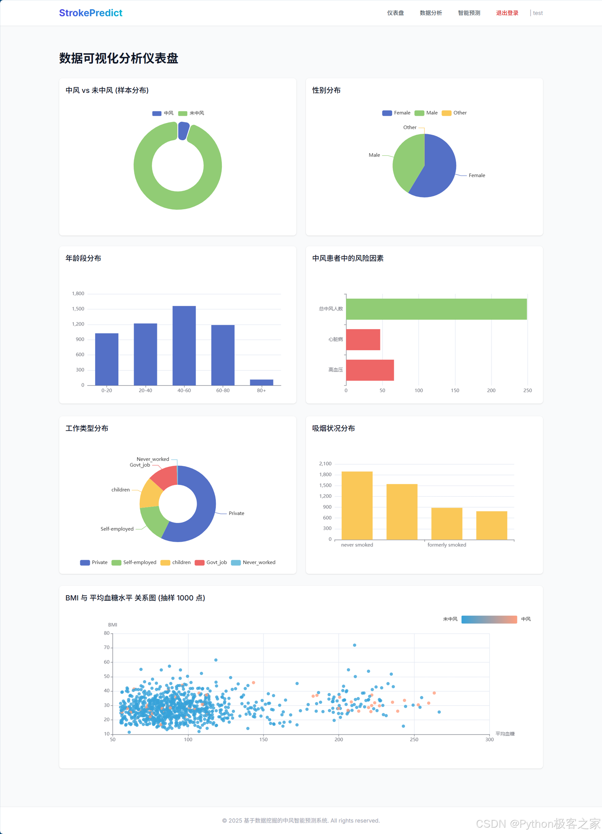 - 多维展示: 包含中风样本分布、风险因素(高血压/心脏病)占比、BMI 与血糖的散点图分析等。