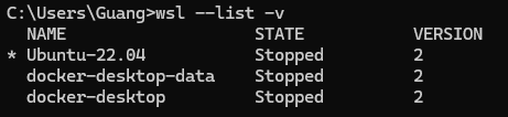 操作之后再输入wsl --list -v命令,列出已注册的 WSL 发行版信息检查state是否都变成stopped。