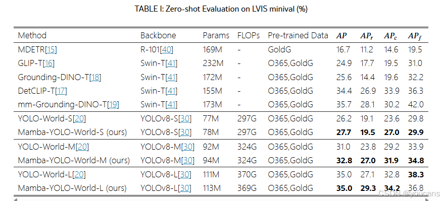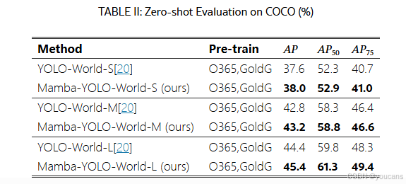 - 实验表明,本模型在保持相当参数量和计算量的同时超越原始YOLO-World,并以更少的参数量与计算量超越现有先进开放词汇检测方法。