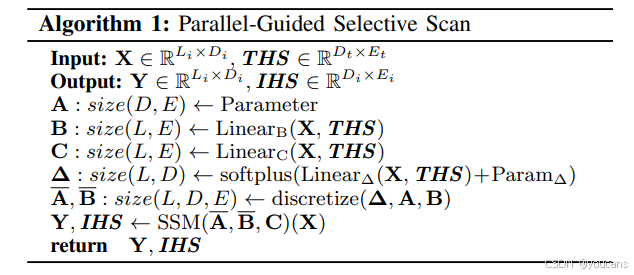 其中 𝐸 为状态空间模型的状态扩展因子, 𝐴 ∈ R E x E 𝐴 ∈ ℝ^{ExE} A∈RExE 为状态转移矩阵,$𝐵 ∈ ℝ^{Ex1} 和 𝐶 ∈ R 1 x E 𝐶 ∈ ℝ^{1xE} C∈R1xE 分别为输入与输出映射矩阵。基于状态空间模型,Mamba[21]引入选择性扫描算法,使 𝐴、𝐵、𝐶 成为输入序列的函数。