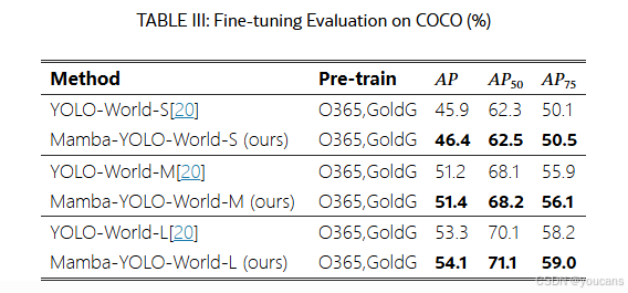 在表III中,我们进一步评估了COCO基准上的微调结果。在COCO train2017数据集上进行微调后,Mamba-YOLO-World获得了更高的检测精度,所有规模变体均稳定超越微调后的YOLO-World模型,AP指标提升幅度达0.2%~0.8%。