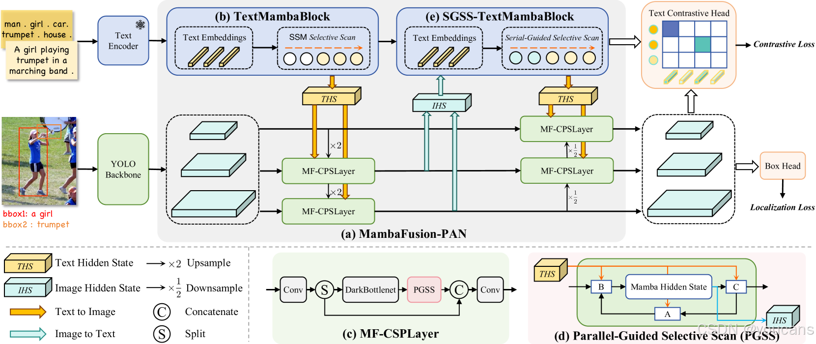 如图2©所示,我们通过MambaFusion CSP层将文本隐状态与多尺度图像特征进行集成。该层将提出的并行引导选择性扫描算法融入YOLO CSP层风格网络。经MF-CSP层处理后,既可获得输出图像特征,还能生成图像隐状态 𝐼𝐻𝑆 ∈ ℝᴰⁱ×ᴱⁱ,用于后续图像→文本特征融合。