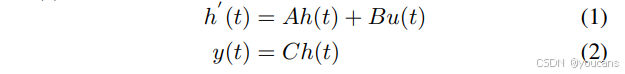 对于连续输入信号 𝑢 ( 𝑡 ) ∈ R 𝑢(𝑡) ∈ ℝ u(t)∈R,状态空间模型[32]通过隐状态 h ( 𝑡 ) ∈ R E ℎ(𝑡) ∈ ℝᴱ h(t)∈RE 将其映射为连续输出信号 𝑦 ( 𝑡 ) ∈ R 𝑦(𝑡) ∈ ℝ y(t)∈R: