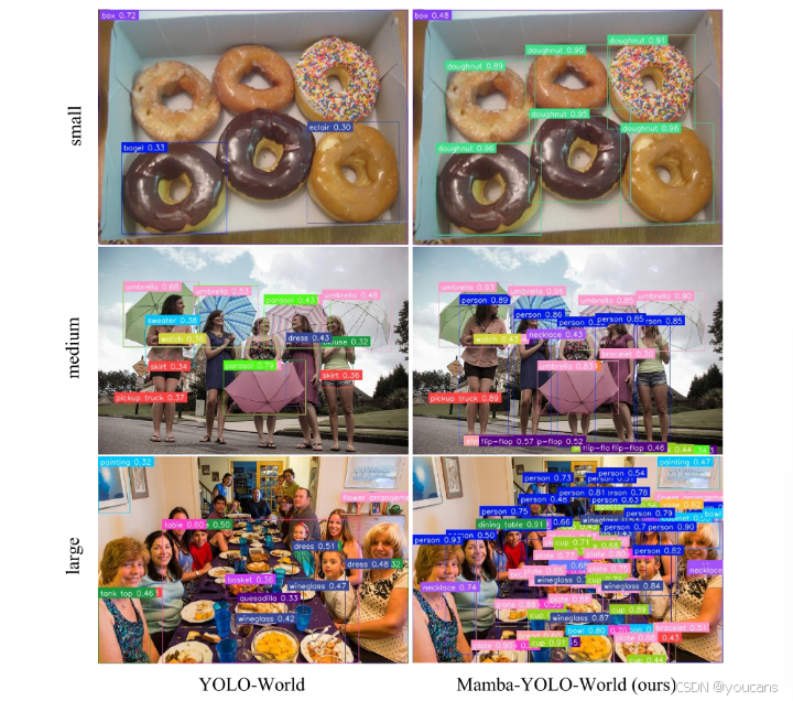 图1:零样本推理在LVIS[9]上的可视化结果。我们的Mamba-YOLO-World在准确性和从小型到大型模型的泛化能力上显著优于YOLO-World。