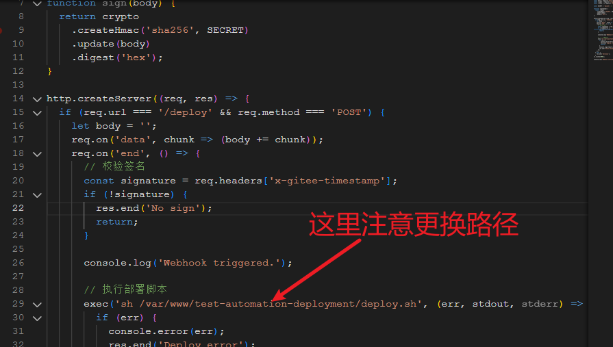 const SECRET = 'abc123'; // 与 Gitee Webhook 密码一致