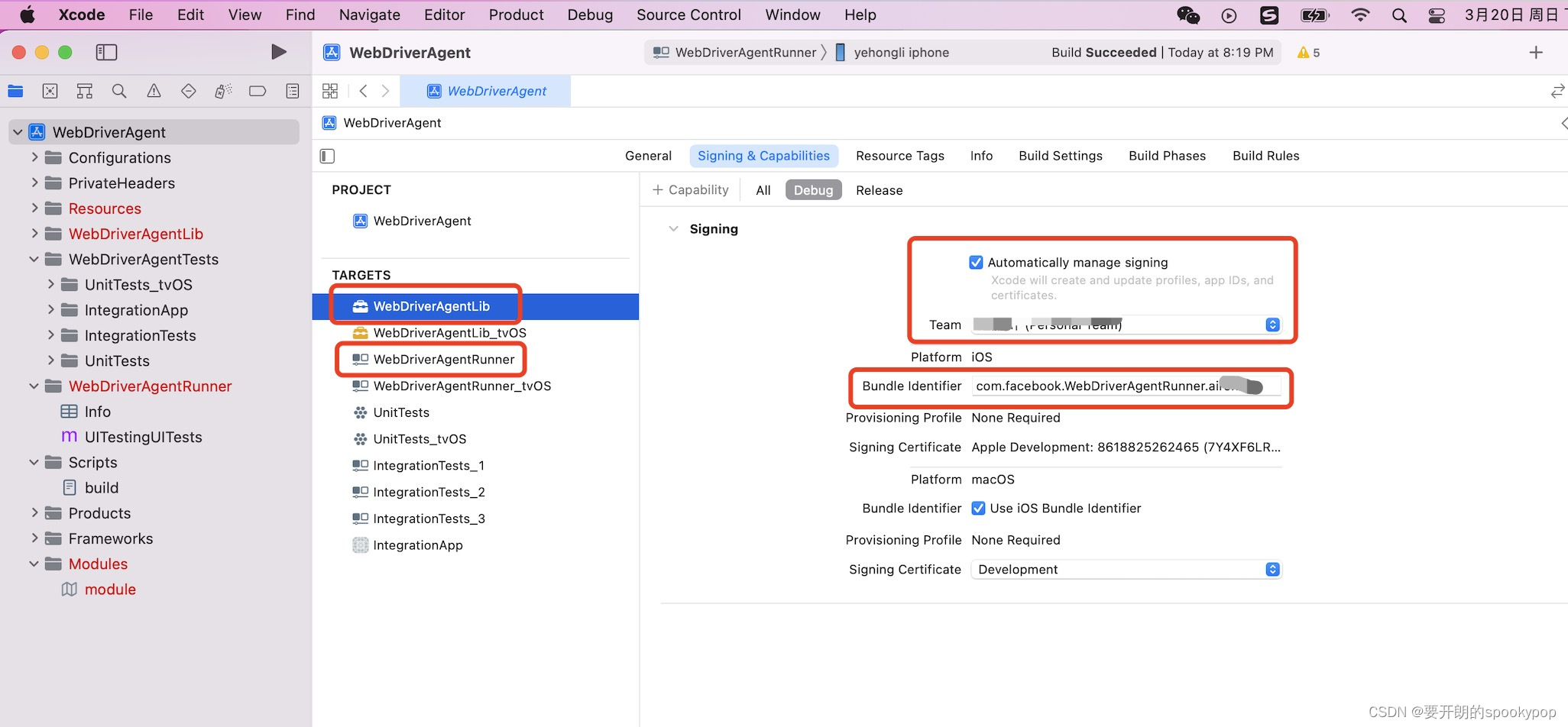 Bundle Identifier(红框2)为唯一值(如com.yourname.WebDriverAgentRunner,避免与其他项目冲突)。 - 对
