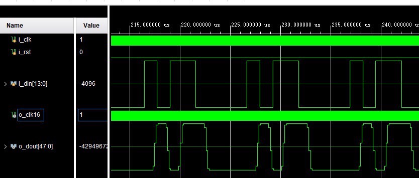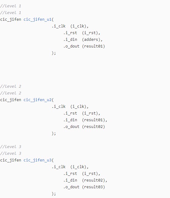 上面这段代码就是简单的五级CIC滤波器Verilog实现。模块定义了输入时钟、复位信号,14位的输入数据以及40位的输出数据。通过两个数组delay1**和delay 2来实现延迟单元。在时钟上升沿或者复位信号有效时,复位延迟单元和输出数据。正常工作时,先将输入数据扩展为40位存入delay1**数组,然后数据在延迟单元1中依次传递,完成积分部分的操作。再在delay 2数组中传递,简单模拟梳状部分操作,最后输出结果。