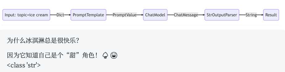 # 在这个链条中,用户输入被传递给提示模板,然后提示模板的输出被传递给模型,然后模型的输出被传递给输出解析器。