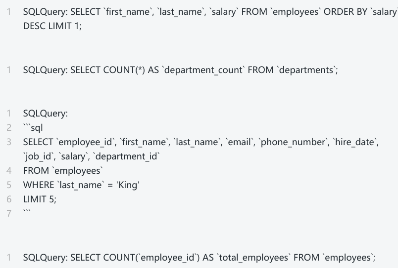 # response = chain.invoke({"question": "数据表employees中哪个员工工资高?"})