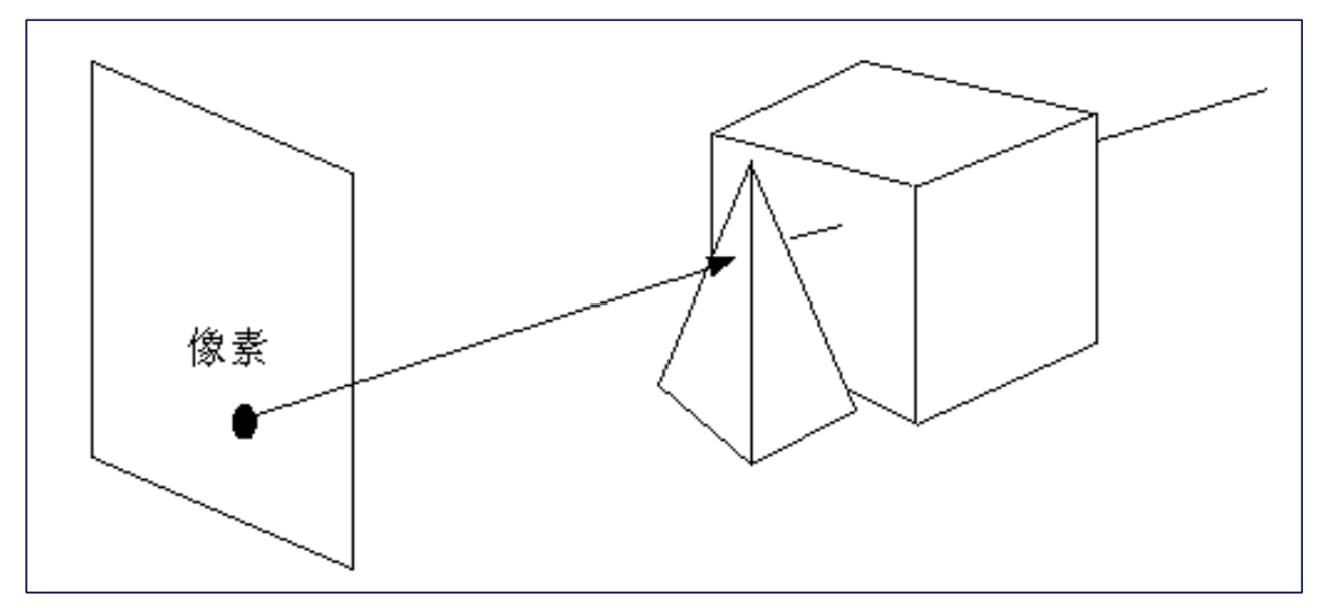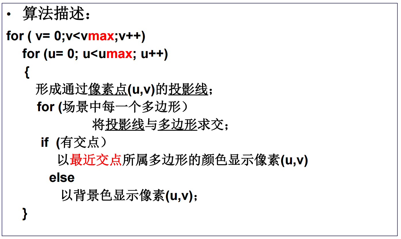 ①将通过绘图窗口内每一个像素的投影线与场景中的所有多边形求交。