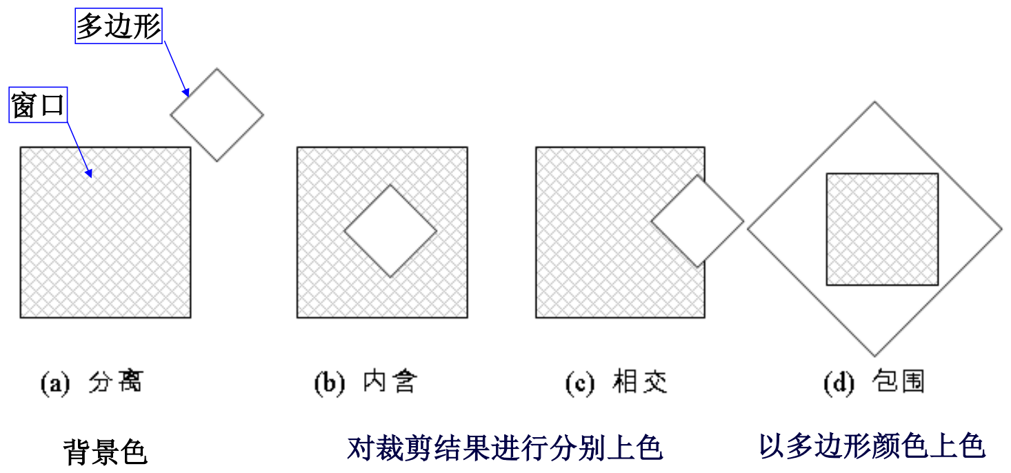 ①窗口为空,即多边形与窗口的关系是分离的------取背景色,图中(a)