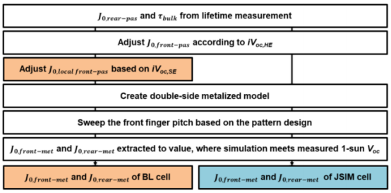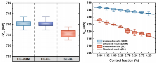 左:经过相应烧结工艺后,HE和SE前驱体的iVoc;右:具有不同正面接触面积分数的子电池的测量与Voc,用于评估JSIM电池和BL电池的正面与背面金属诱导复合