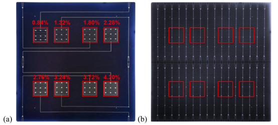 用于提取金属诱导复合的特殊子电池设计:(a) 正面采用不同接触面积分数的设计;(b) 背面采用与每个正面子电池对应图案相同的栅线设计