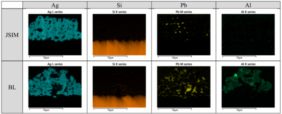 JSIM和基准(BL)样品正面金属接触的横截面EDS分析结果(展示主要元素差异)