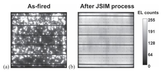 图1a所示的 (a) 烧结后均匀发射极(HE)电池和 (b) 经过JSIM工艺后的HE电池的EL图像