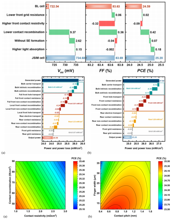 上:瀑布图,显示了BL与JSIM TOPCon太阳电池之间的主要差异对Voc、FF和PCE的影响;中:(a) BL电池和(b) JSIM电池的自由能损失分析;下:(a)正面接触电阻率与接触复合电流密度变化对PCE的影响;(b)正面栅线接触宽度与接触间距变化对PCE的影响