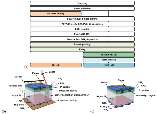 基础制绒与掺杂:所有硅片先经清洗制绒形成金字塔表面,再通过硼扩散制备正面 p⁺发射极;BL 电池额外通过激光掺杂形成局部 p⁺⁺选择性发射极(SE),JSIM 电池则采用均匀发射极(HE)结构。