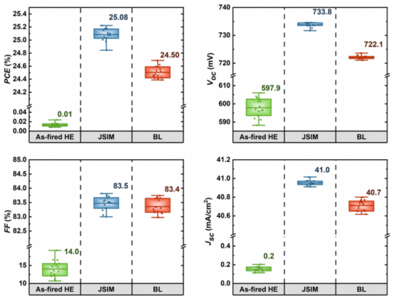 图1a所示的烧结后HE电池、JSIM电池和BL电池的单日光照下PCE、Voc、FF和Jsc值