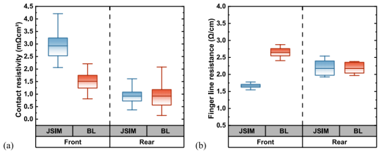 JSIM电池和BL电池的 (a) 正面与背面接触电阻率及 (b) 正面与背面栅线电阻