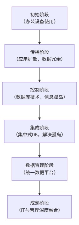 - 数据管理阶段:信息成为核心资源,统一数据管理平台,实现全企业资源共享。