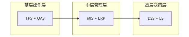 - 管理信息系统(MIS):中层管理层,整合 TPS 数据,提供管理决策支持(如生产计划、财务分析)。