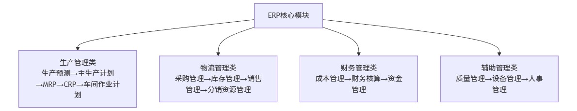 - 特点:跨部门集成、供应链全覆盖、支持多工厂 / 跨国运作。