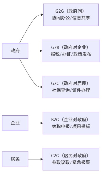 - 政府对居民(G2C):证件办理、信息查询、公共服务(如社保查询)。