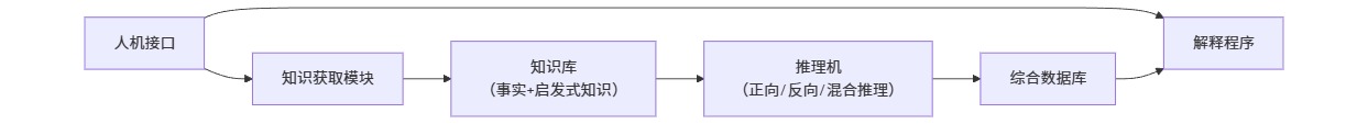 - 核心组成:知识库(事实 + 启发式知识)、推理机(正向 / 反向 / 混合推理)、综合数据库、知识获取、解释程序、人机接口。