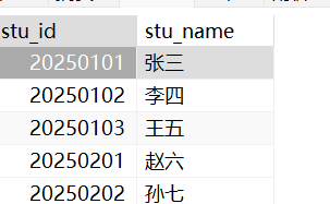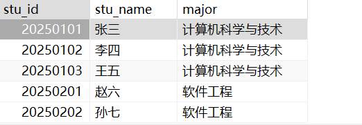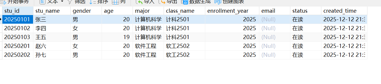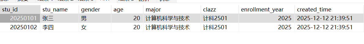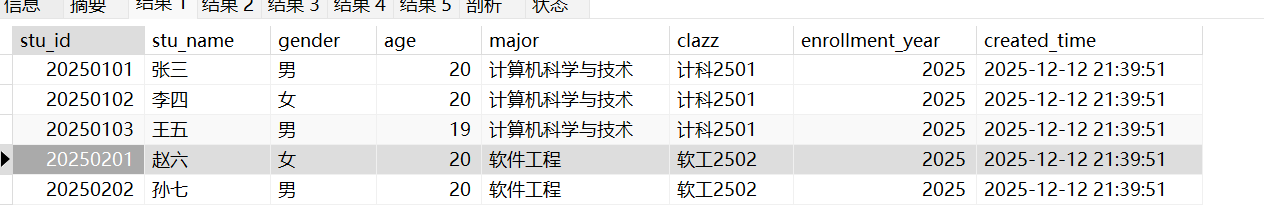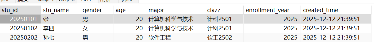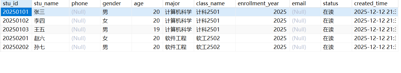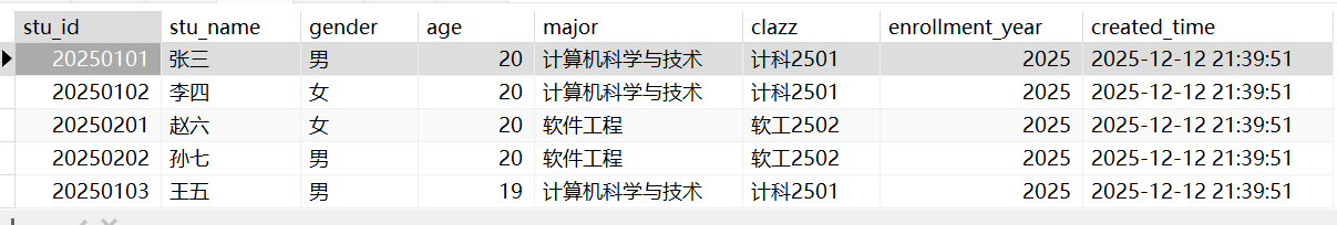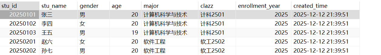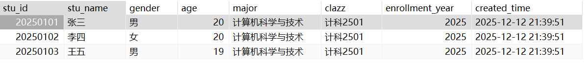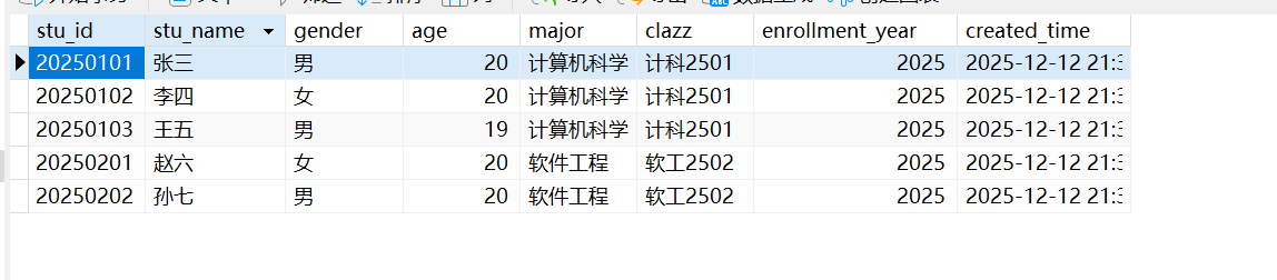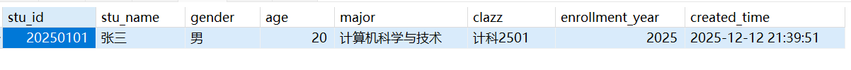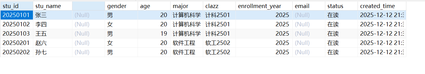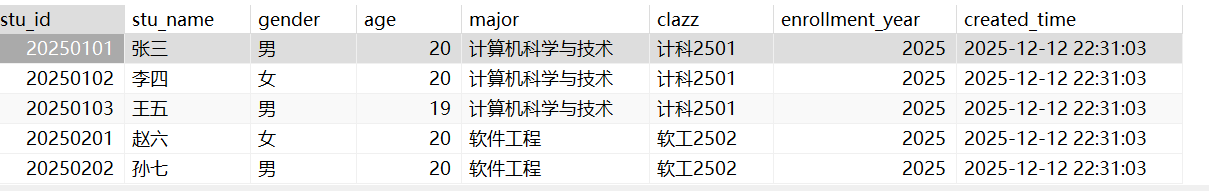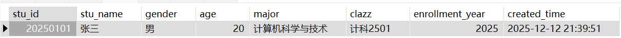 (20250101, '张三', '男', 20, '计算机科学与技术', '计科2501', 2025);