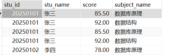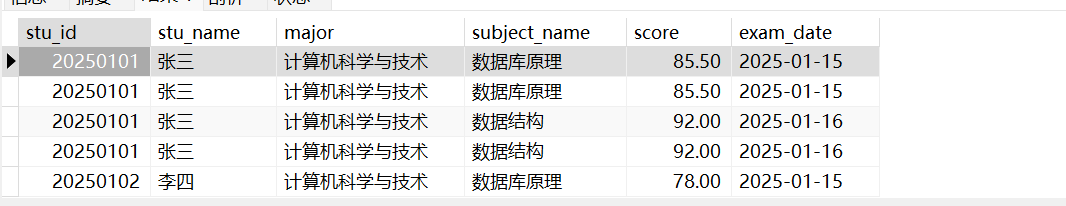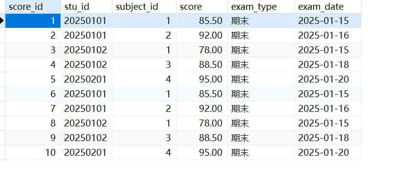 (20250101, 1, 85.5, '期末', '2025-01-15'),