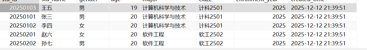 (20250103, '王五', '男', 19, '计算机科学与技术', '计科2501', 2025, NOW()),
