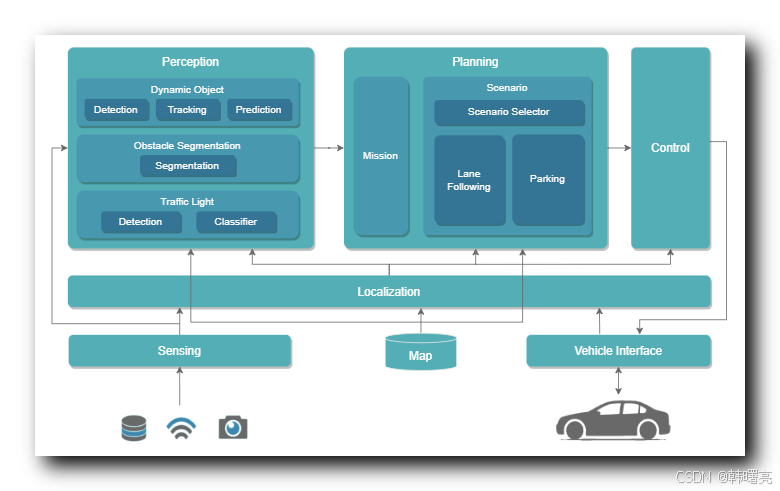 - 感知模块 : 识别道路、障碍物、交通信号等 ;