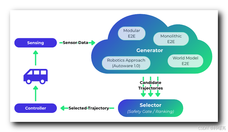 轨迹生成器 ( Generator ) : 所有的 传感器数据 都要送入到 " 轨迹生成器 " 中 , 这是一个很灵活的 轨迹生成模块 , 轨迹生成器 指任何能够 输出行驶轨迹的模块 , 它可以是以下一种或多种形式 :