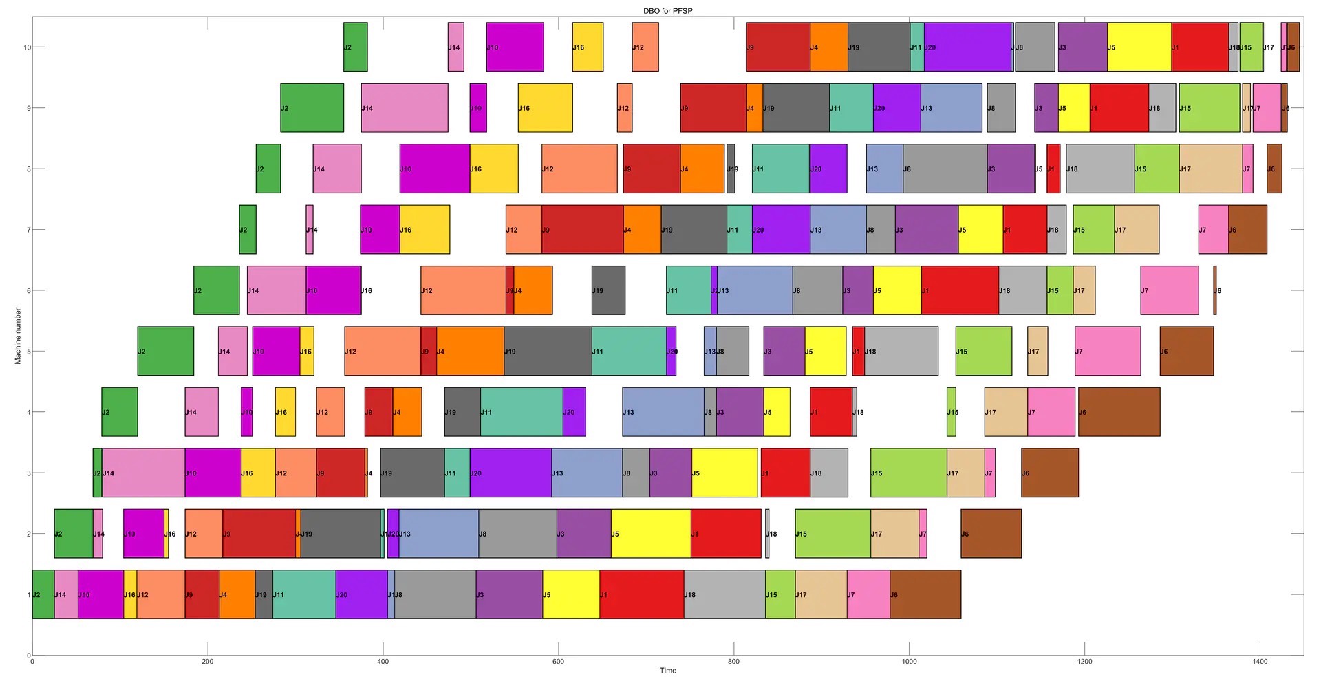 利用蜣螂优化(DBO)算法求解置换流水车间调度问题(Permutation flow-shop scheduling problem, PFSP) 其中:main.m是主函数运行即可;DBO.m是算法的代码;color_selection用于获得甘特图的颜色配置;gantt_chart.m绘制甘特图;objective.m是目标函数,即计算Makespan;sorting.m根据调度方案计算每台机器任意时刻的加工信息(开始时间、结束时间、工件号、机器号), 用于绘制甘特图;调度测试集包括Car和Rec 输出结果包括:Makespan、工件排序、计算时间、最优适宜度收敛曲线、平均适宜度收敛曲线、甘特图 利用DBO得到的20工件×10机器的调度结果甘特图演示如下(随机运行一次的结果):