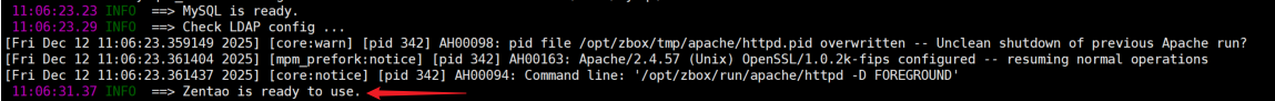 4.再次查看容器日志,容器有输出"Zentao is ready to use.",并且web可正常访问,那么问题支持就解决了