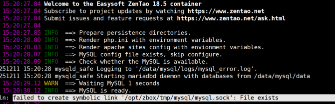 1.最近刚把服务器停机迁移后重启禅道查看日志一直报错:failed to create symbolic link '/opt/zbox/tmp/mysql/mysql.sock': File exists
