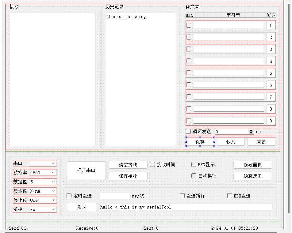 //默认设置控件不能操作,当没打开串口的时候,发送部分全不能操作(groupBoxDownRightLow这部分)。