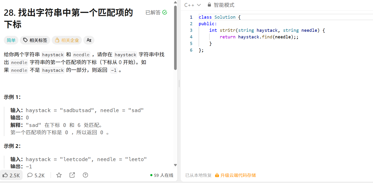 return haystack.find(needle); // 库函数实现,面试建议手写KMP